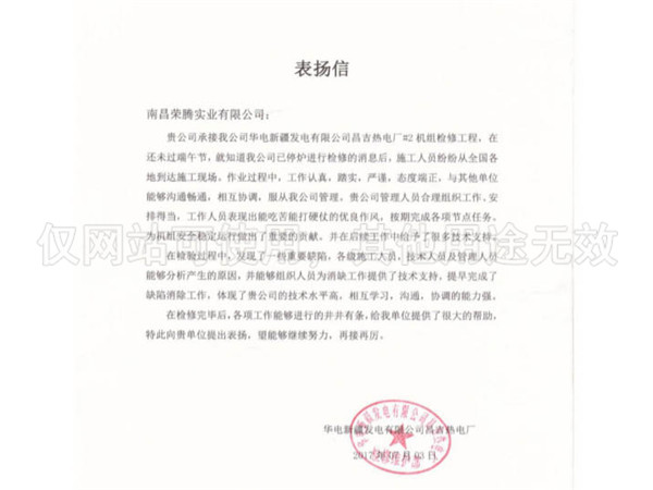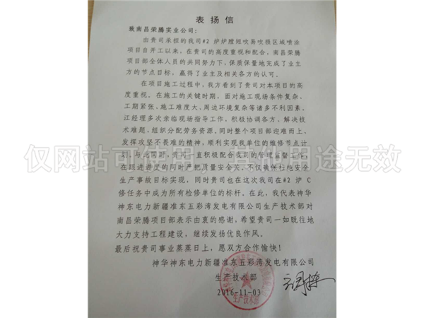 新疆昌吉電廠表揚信
